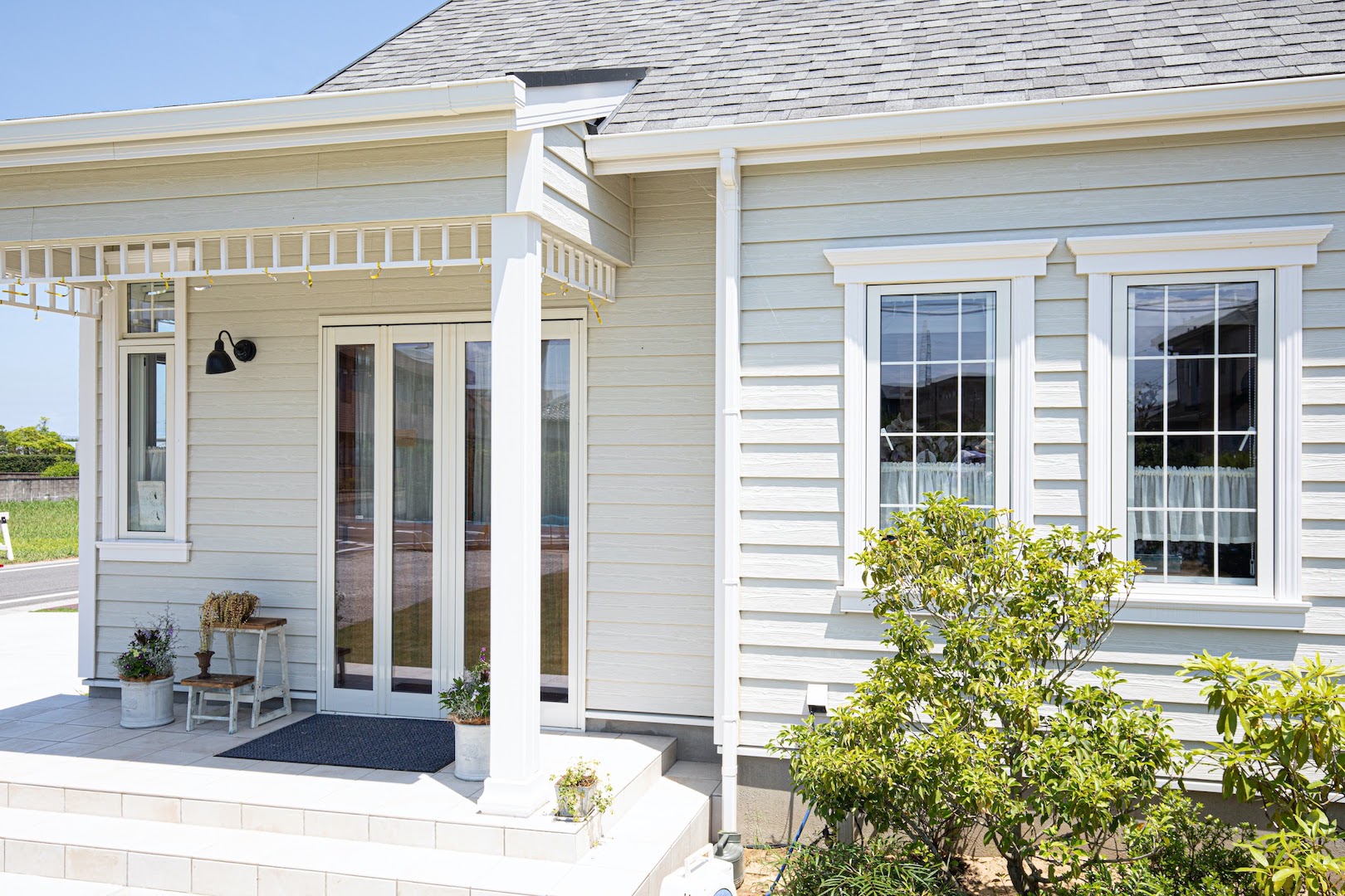 洋風住宅の多くで採用される《カバードポーチ》。建物の外の、屋根付きのテラスやデッキ部分を指します。リビングの延長というプライベート感と同時に、半屋外という開放感があり、そのスペースをおしゃれで快適な空間に演出してくれます。